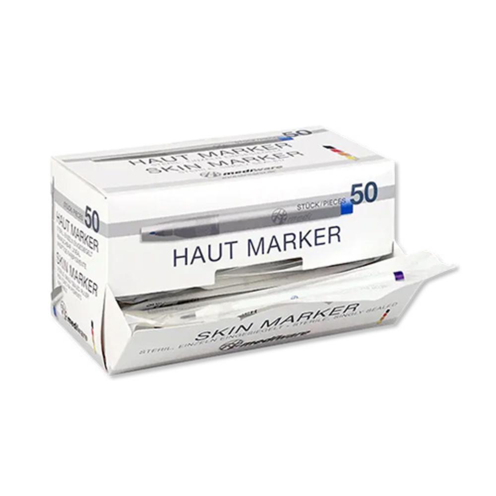 Der Standard-Hautmarker bietet eine Strichstärke 0,5 und 1,0 mm. Die violette Schreibfarbe ermöglicht gut sichtbare Markierungen für präzise Kennzeichnungen. Egal ob unter feuchten Bedingungen oder bei Schweiß - diese Marker sind wasserfest und halten stand. Und das Beste: Sie sind auch nach Gebrauch leicht mit  Desinfektionsmittel abwaschbar.