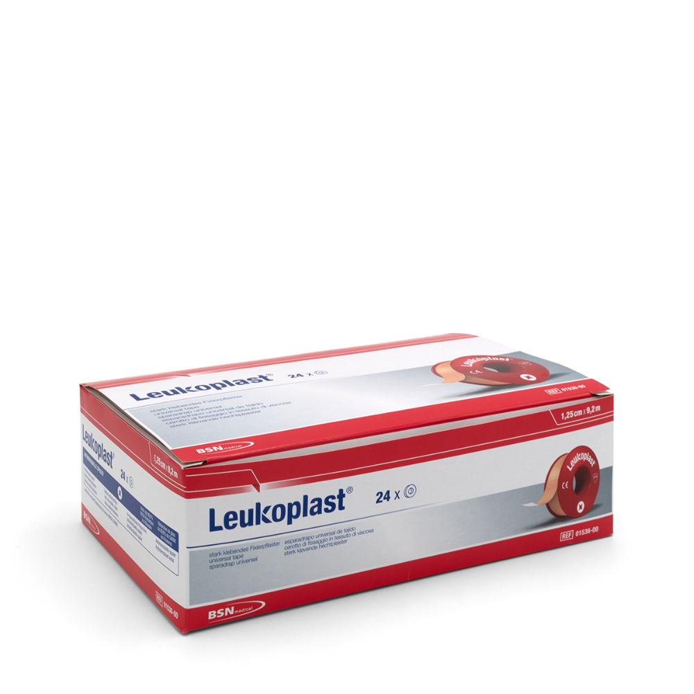 Rollenpflaster sollten möglichst individuell auf den Hauttyp und Anwendungsfall abgestimmt sein. Leukoplast® ist immer dann zu empfehlen, wenn die Fixierung ganz besonders sicher kleben muss. Leukoplast® ist ein wasserabweisendes, hautfarbenes Fixierpflaster mit wasserabweisender Oberfläche für normal empfindliche Haut. Es ist außergewöhnlich zugfest und weist eine hohe Sofort- und Dauerklebkraft auf. Leukoplast® haftet auch bei starker Belastung fest und sicher und ist luft- und wasserdampfdurchlässig. Leukoplast® besteht aus einem Träger mit wasserabweisender Oberfläche aus Zellwolle (Viskose), beschichtet mit Kautschuk Harz-Kleber. Antimikrobielle Spule und Schutzring von Hand reißbar, zuverlässige Klebkraft. Die Oberflächen der Spule und des Schutzrings sind antimikrobiell beschichtet, sodass mehr als 99,9 % der MRSA-Keime innerhalb von sechs Stunden eliminiert werden. (Dies gilt nur für Produkte mit Spule und/oder Schutzring)