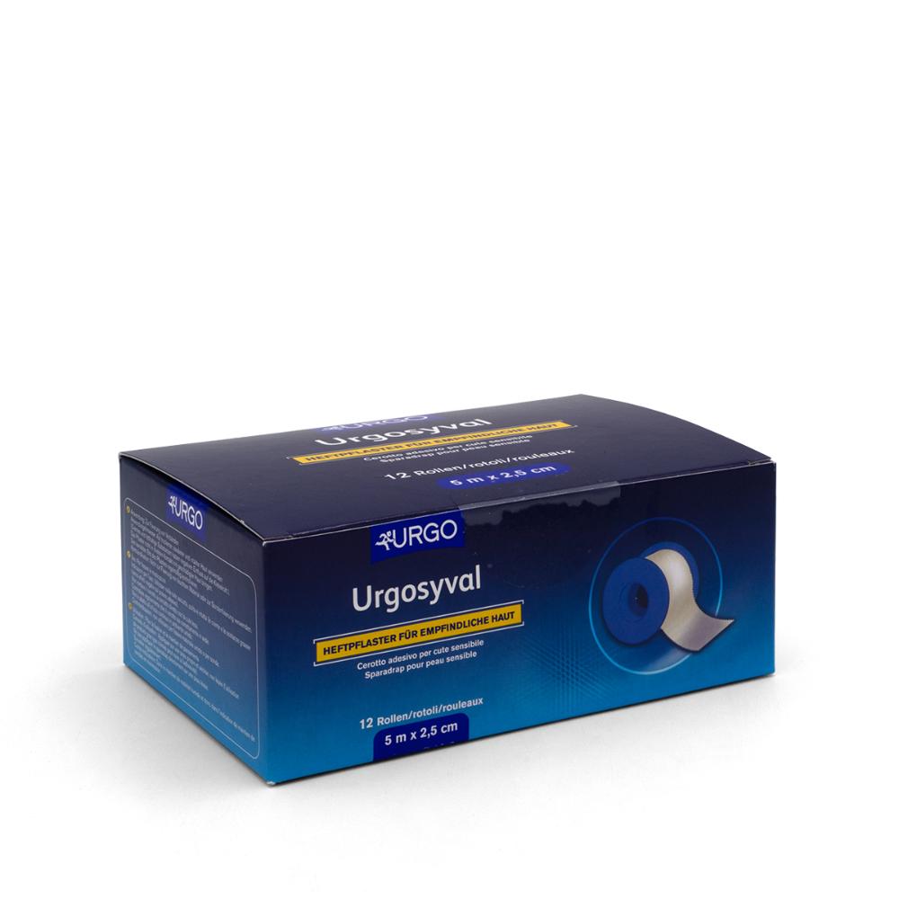 Urgosyval ist ein weißes mikroporöses Gewebepflaster, das die Haut atmen lässt und Fixierunq/Befestigung von Verbänden und medizinischen Geräten dient.